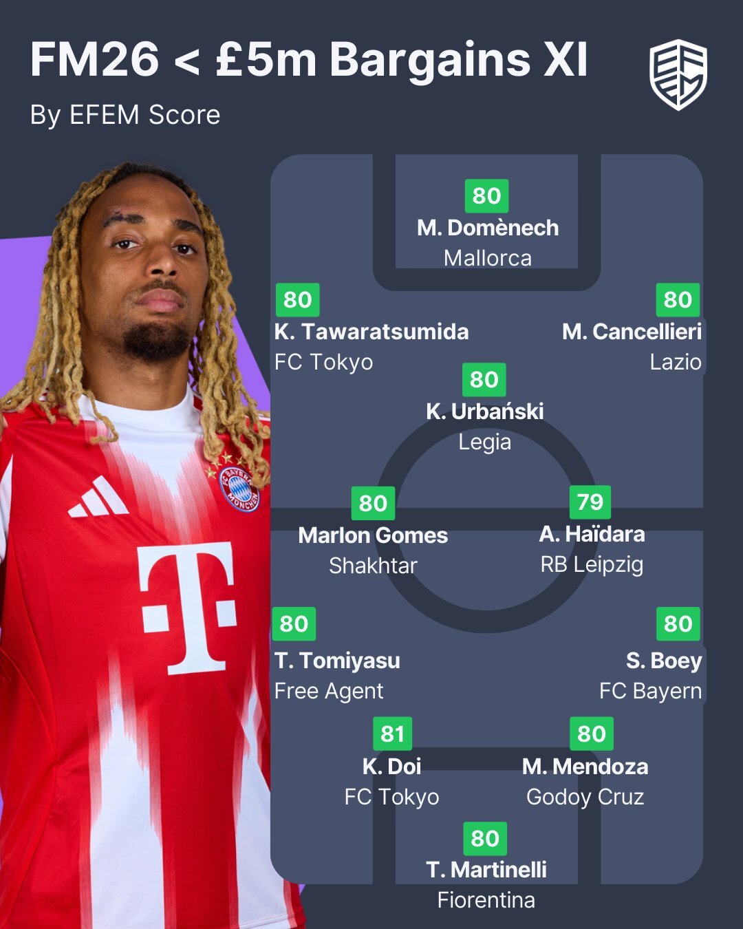 If you’re trying to build a proper squad on a budget in FM26, this is the sweet spot: players who are either undervalued by league/reputation (the J-League and Argentina picks), blocked by bigger names (the Lazio/Bayern/Leipzig ones), or simply sitting there because the market has written them off for reasons that aren’t purely about ability (Tomiyasu being a free agent is the obvious example).