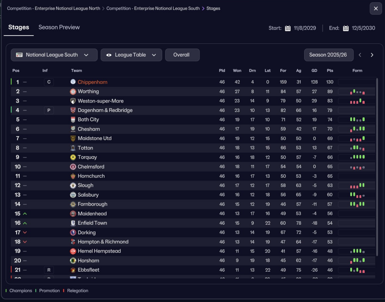 Chippenham recover, scrape into the playoffs, and somehow win promotion to the Premier League via penalties at Wembley. Five seasons. Five promotions. A squad built almost entirely on sprinting.