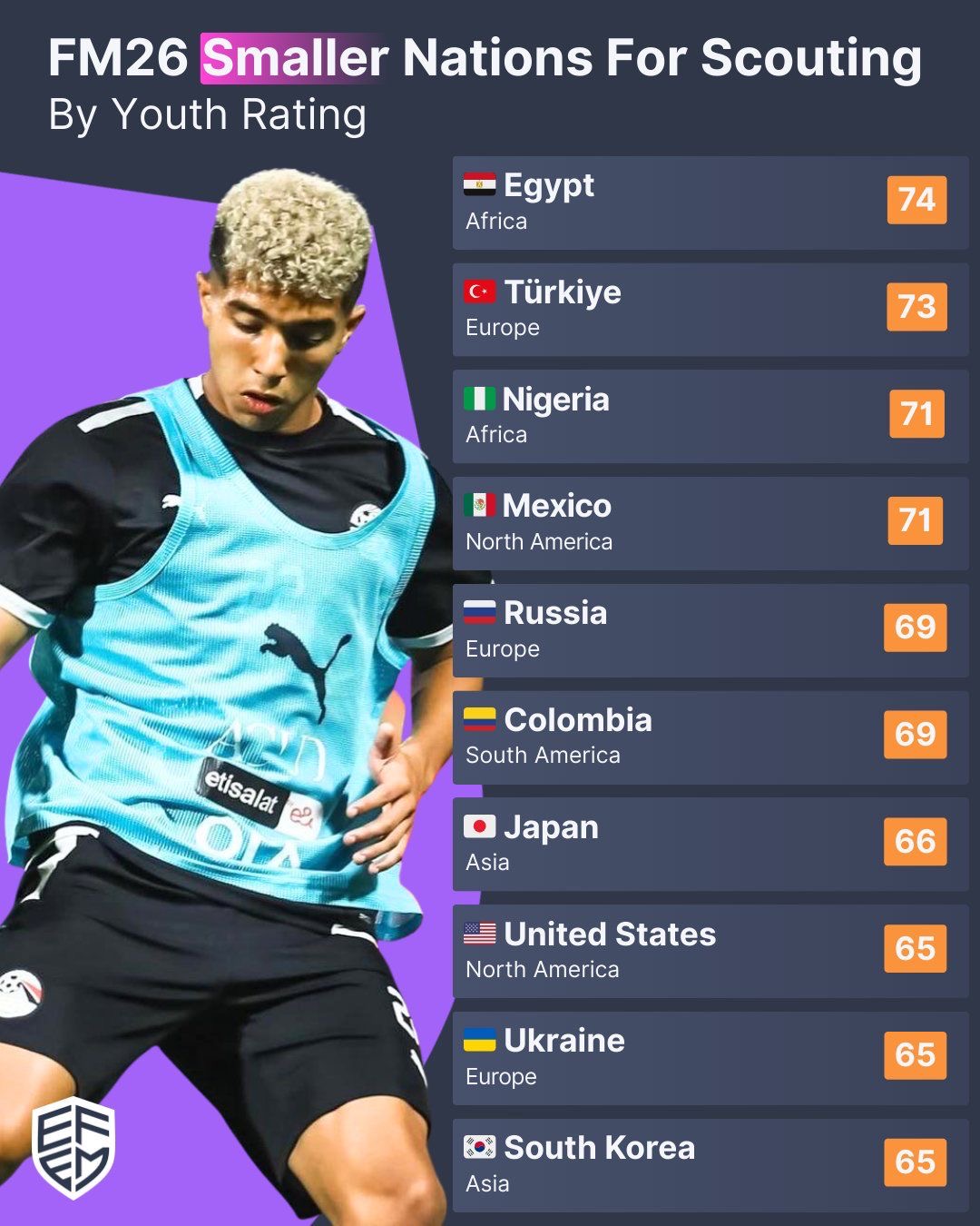 Yesterday, I asked where you can find cheap wonderkids. The kind of places where you can pick up the next Neymar for the price of a Tesco meal deal. The incredible people at EFEM.club have done the heavy lifting. They’re a data insights site for Football Manager, and they’ve worked out which underrated nations offer the best value based on youth ratings. These aren’t your usual suspects like France or Brazil. They’re countries with slightly lower reputations but serious production lines. So, without further ado, let’s get into it.