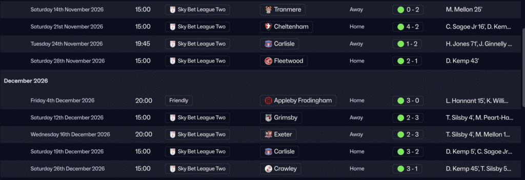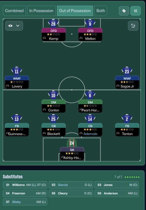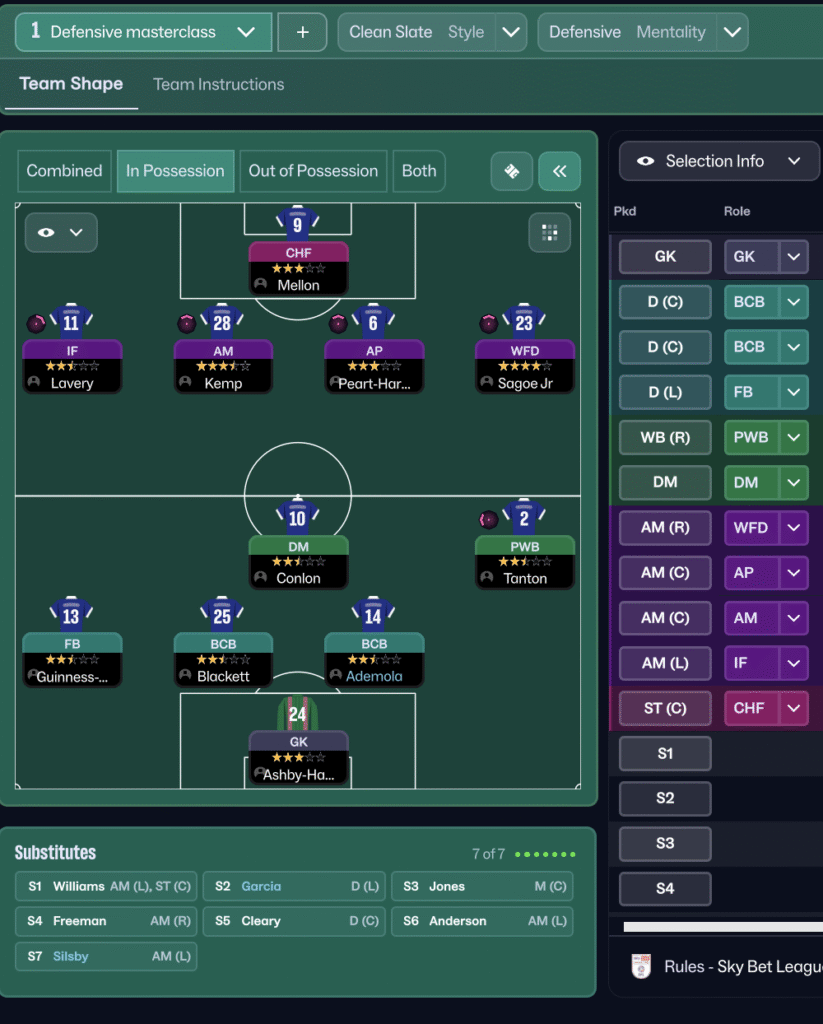 Out of possession, the aim is to make it as difficult as possible for the opposition to play through the middle. You’re pressing in a mid-block and raising the defensive line so they have little room to work with. Honestly though, this tactic’s biggest strength comes from its attacking play. We’ve conceded 36 goals in 26 games and have basically relied on outscoring the opposition. So if you want to take this tactic to the next level, figure out how to make it a bit tighter defensively. Then you’d have a truly game-breaking setup. (Although, in fairness, the number of goals conceded might just be because I’m managing Oldham.)
