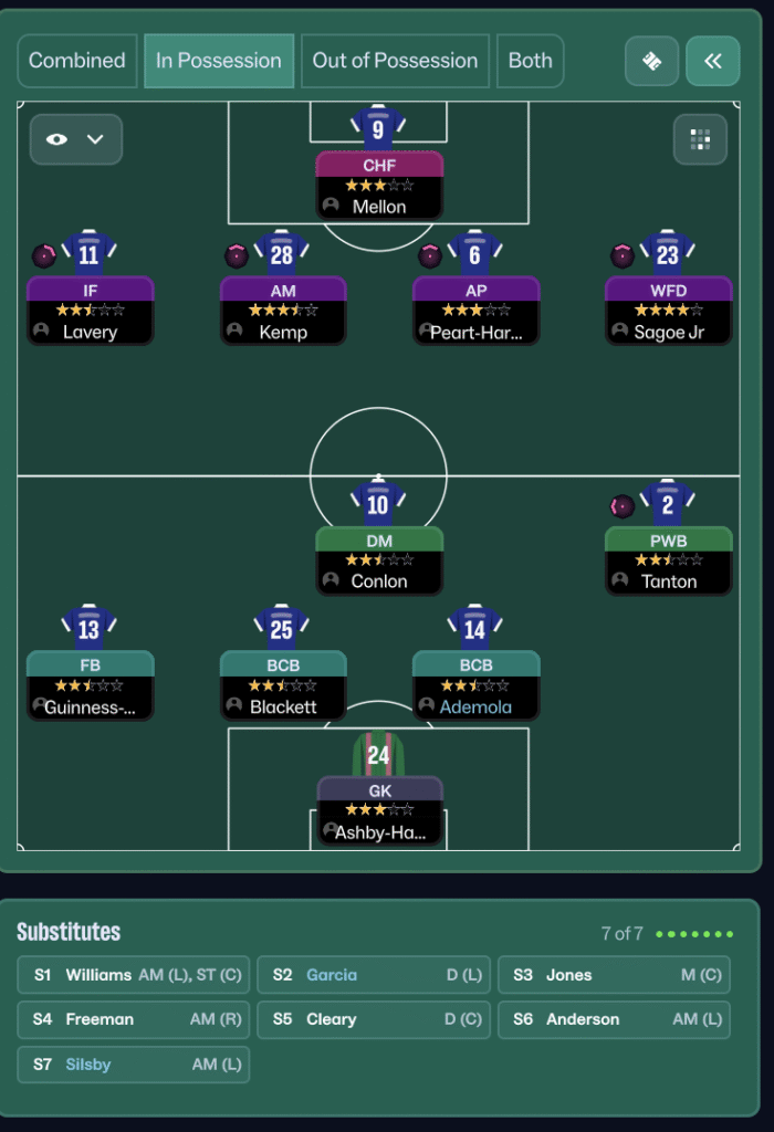 Out of possession, the aim is to make it as difficult as possible for the opposition to play through the middle. You’re pressing in a mid-block and raising the defensive line so they have little room to work with. Honestly though, this tactic’s biggest strength comes from its attacking play. We’ve conceded 36 goals in 26 games and have basically relied on outscoring the opposition. So if you want to take this tactic to the next level, figure out how to make it a bit tighter defensively. Then you’d have a truly game-breaking setup. (Although, in fairness, the number of goals conceded might just be because I’m managing Oldham.)