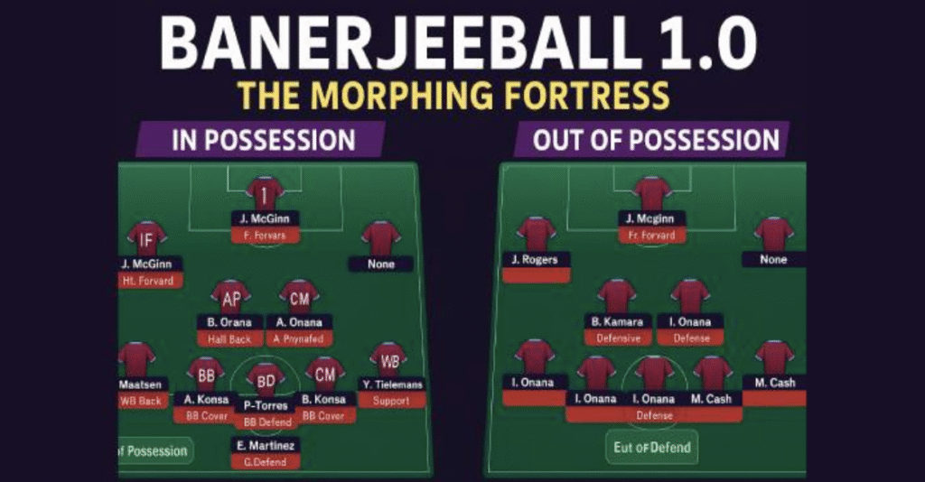 Not all tactics this year have to be high-intensity pressing chaos. Some are built around control, patience and pinning the opposition back. This one is a good example of that. It’s described as a “revolutionary hybrid” shape that plays as a 4-3-3 (Attack) in possession and shifts into a 5-2-3 when defending. The creator used it with Aston Villa and had them in the Champions League places ahead of Liverpool. Not too bad at all.