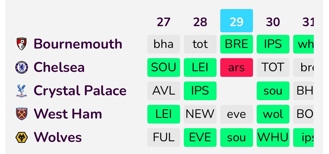 This article will only focus on teams with the best fixtures for the next 4-5 GWs, especially those in GW30-31. Also, 4 out of the 5 teams mentioned all have a fixture in GW29, so even if you later decide not to use your FH in GW29, you can easily keep them for the foreseeable future.