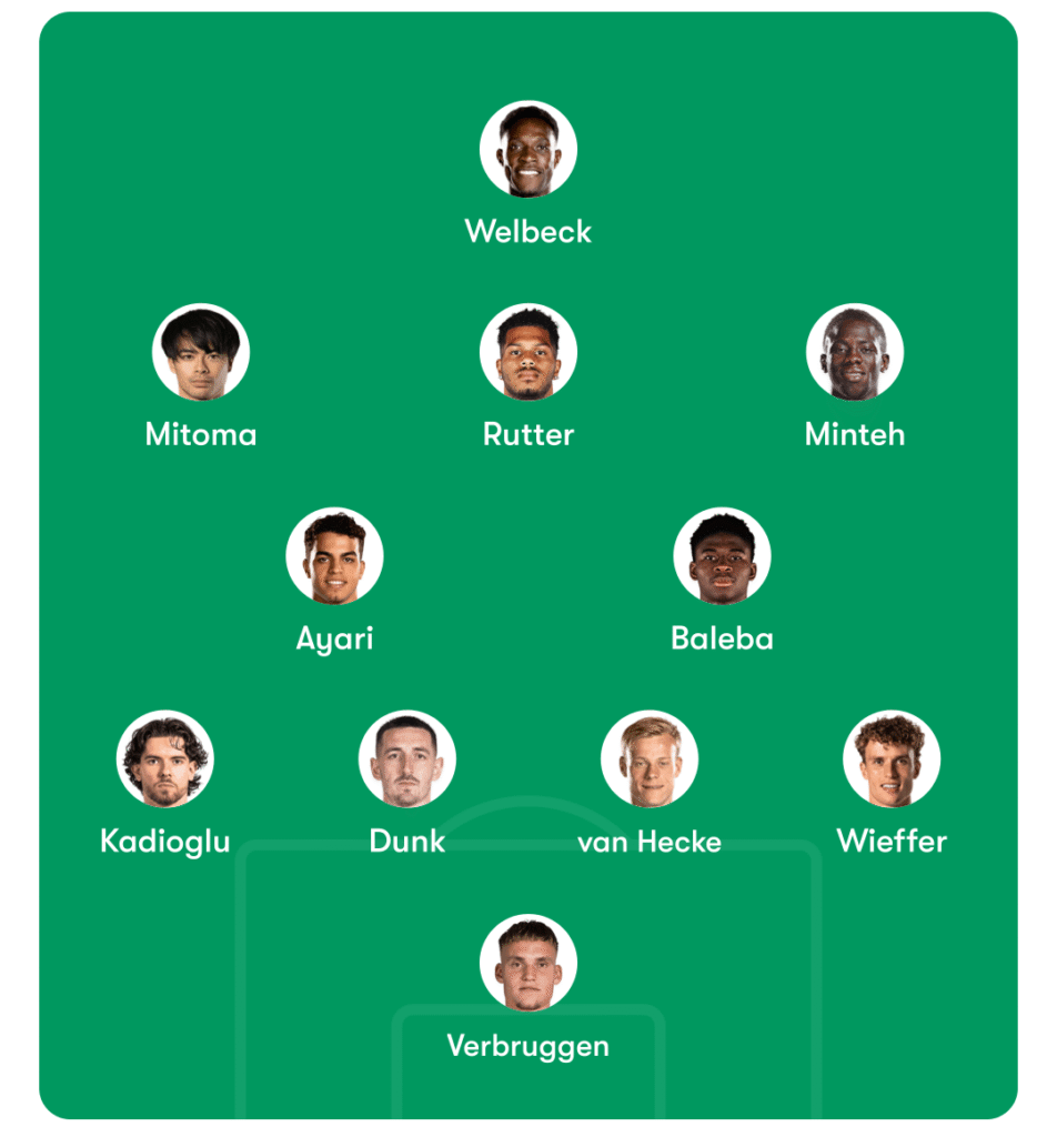 Rutter returned to the squad after an injury kept him out the previous week, and made a cameo off the bench. I think he now returns to the starting XI in GW4 replacing Welbeck. Rutter started as the striker in GW1. Especially as Hurzeler spoke about playing Bournemouth, stating They are a very difficult side to play against. There will be moments when we will suffer and will need to show resilience.” Rutter provides more running power and legs off the ball than Welbeck.