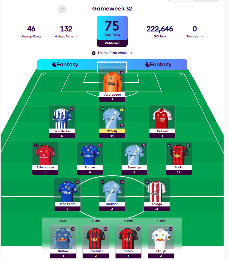 Gameweek 32 was a week of wildcards, triple captains, and the kind of diverging fortunes that can reshape a leaderboard in a single Saturday afternoon. With the average score sitting at just 46 points and the highest score in the game reaching 132, the range of outcomes was enormous — and the top five in the world experienced almost every corner of that spectrum. Here is how it all played out.