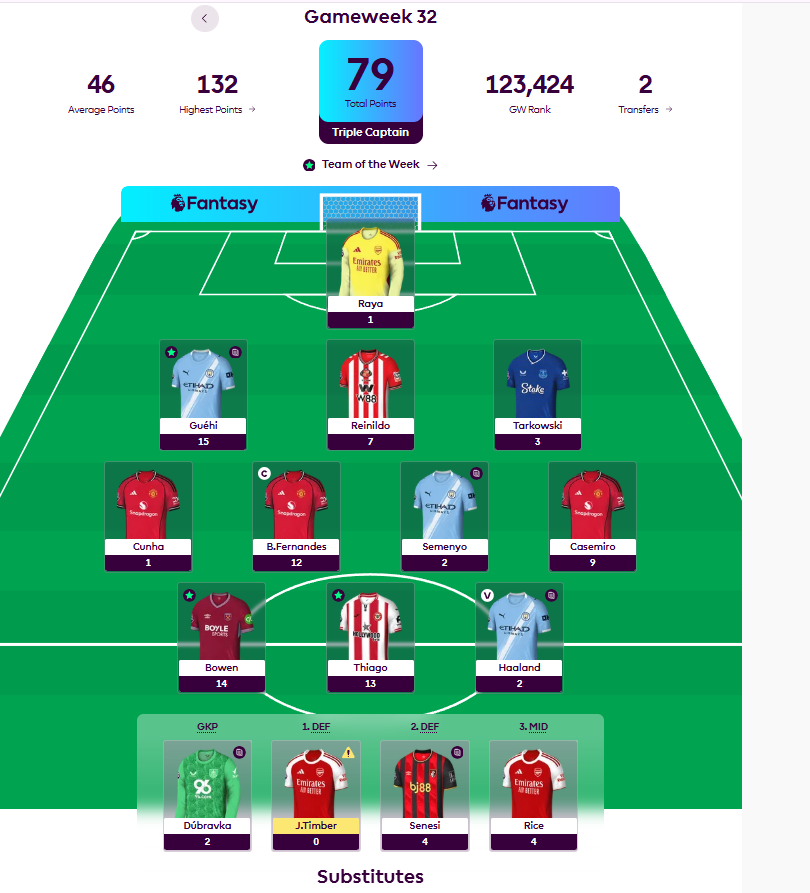 Elsewhere, Bowen (14), Guéhi (15) and Casemiro (9) all contributed meaningfully. Cunha and Haaland both blanked with 1 and 2 respectively, while Raya (1) and Semenyo (2) were quiet.