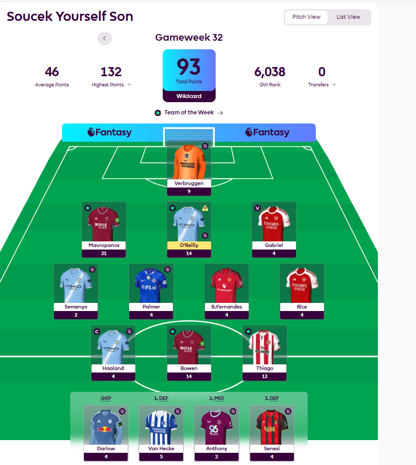 Erik Ibsen enters GW33 still sitting comfortably at the summit with 2,136 points and a 33-point cushion over second place. A score of 75 in GW32 — achieved via a Wildcard. Registering a great week, punctuated by a clutch inclusion of Alex Scott in the starting line-up against Arsenal.