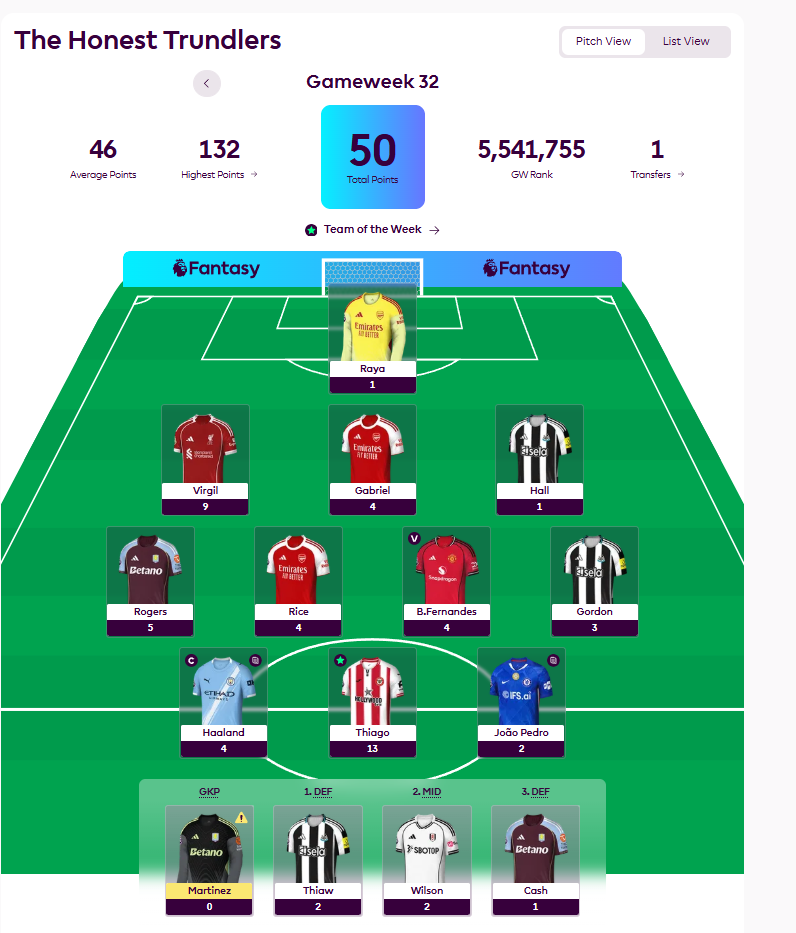 Foster’s score was dragged down by a combination of captain misfire and blanks in key positions, not least the Arsenal defence. Haaland captained and returned just 4 — a blank week by his standards. Thiago perhaps saving what would otherwise have been a bleak week. Foster still has all 4 chips in the bank however, so we can expect him to bounce back in a strong way from next week.