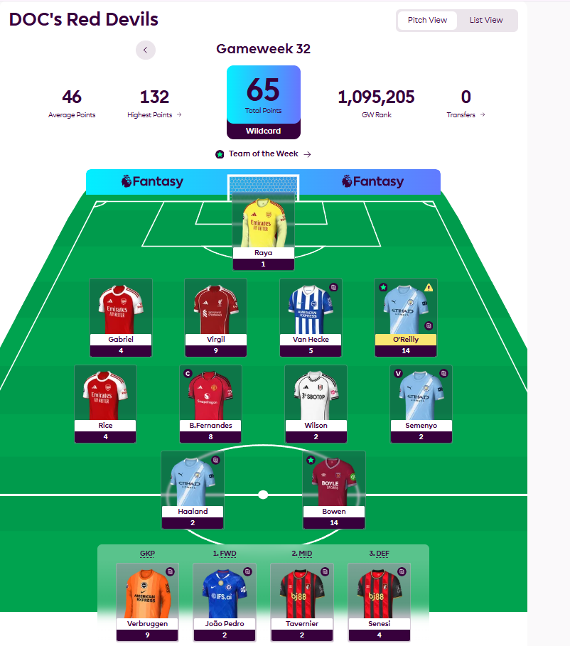 The question heading into GW33 is whether Ibsen’s Wildcard has him optimally positioned for the double gameweek run-in. with Chelsea faltering, O’Reilly getting injured and Bruno, Thiago and Gabriel all not doubling. Although he is in a strong spot, given he still has his bench boost, Free hit and triple Captain Chips in the bag.