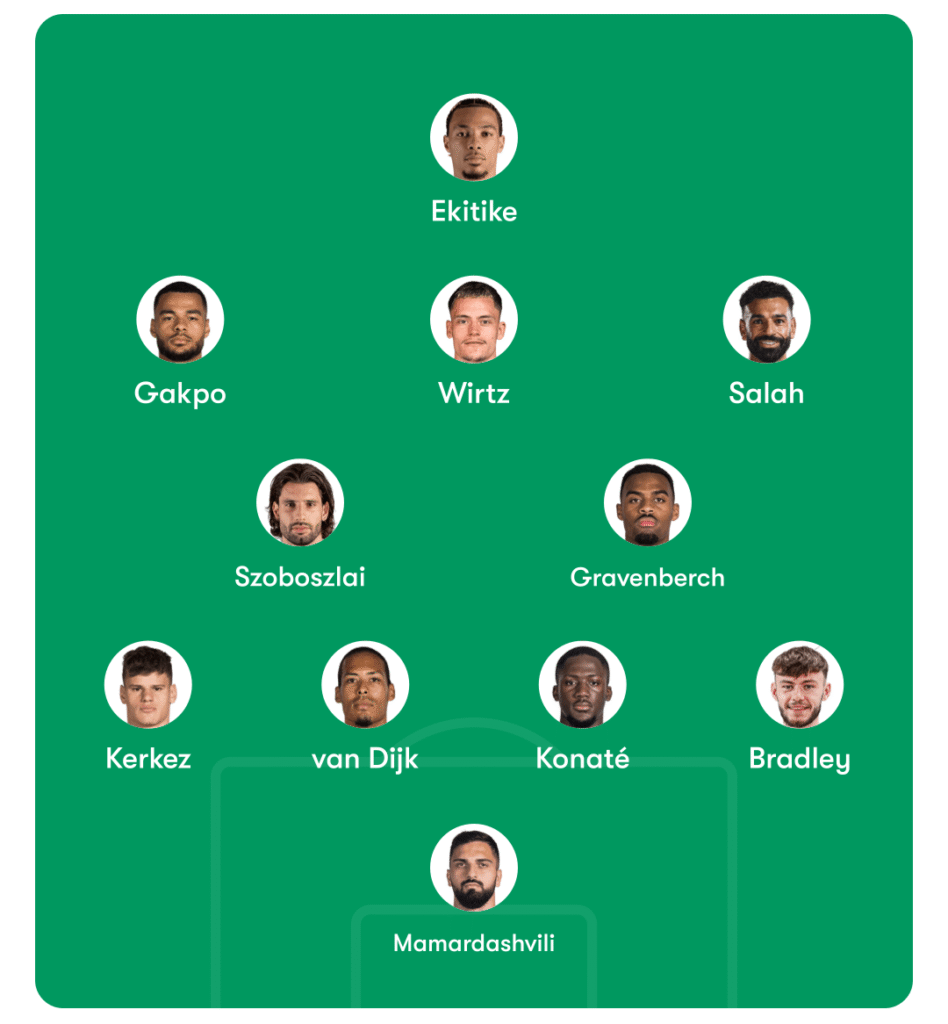 Mac Allister will have to be dropped and Gravenberch may not be fit. If Gravenberch is fit, he would likely start and then one of Szoboszlai or Jones may shift to right-back to allow Wirtz to stay in the team and in his best position. Wirtz was excellent against Frankfurt and notched 2 assists.