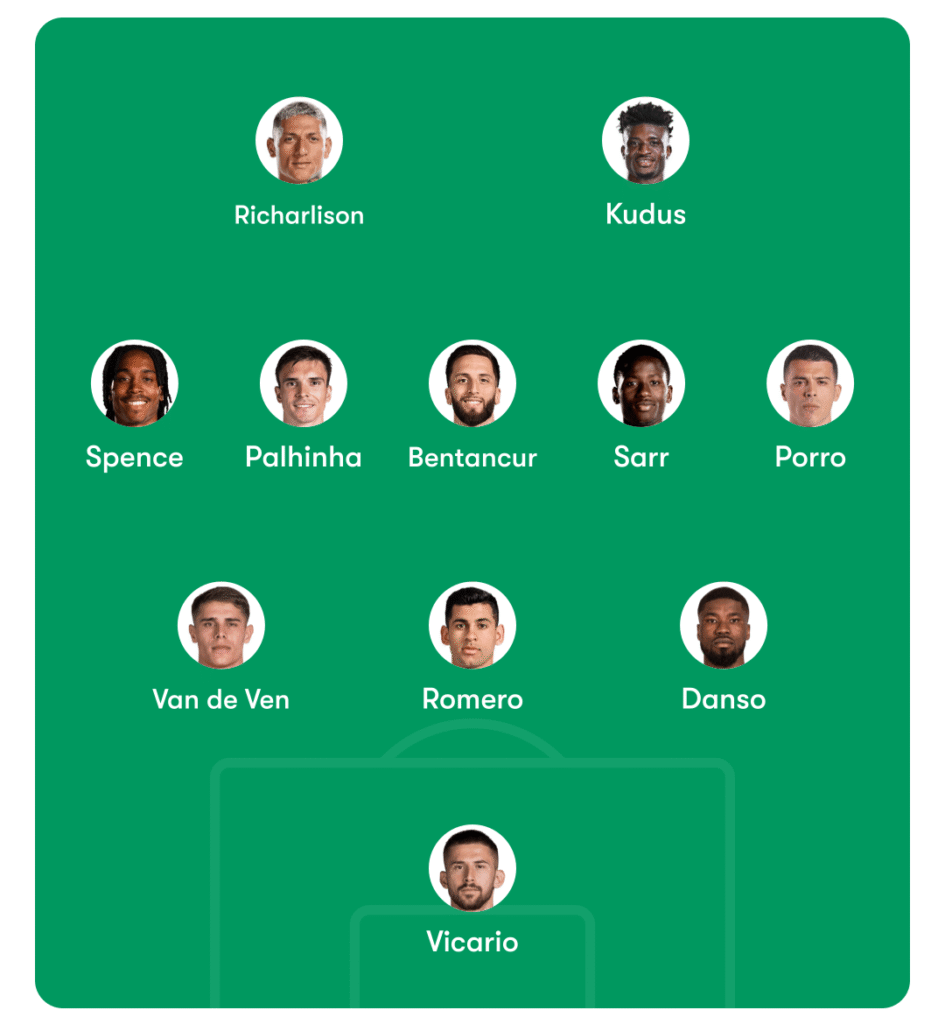 Kudus and Richarlison are the two forwards. Frank spoke on Richarlison on Friday stating firmly that “Right now, he is my starting nine. He scored two fantastic goals. He had two top games, he’s Brazilian number nine.” That settles that then.