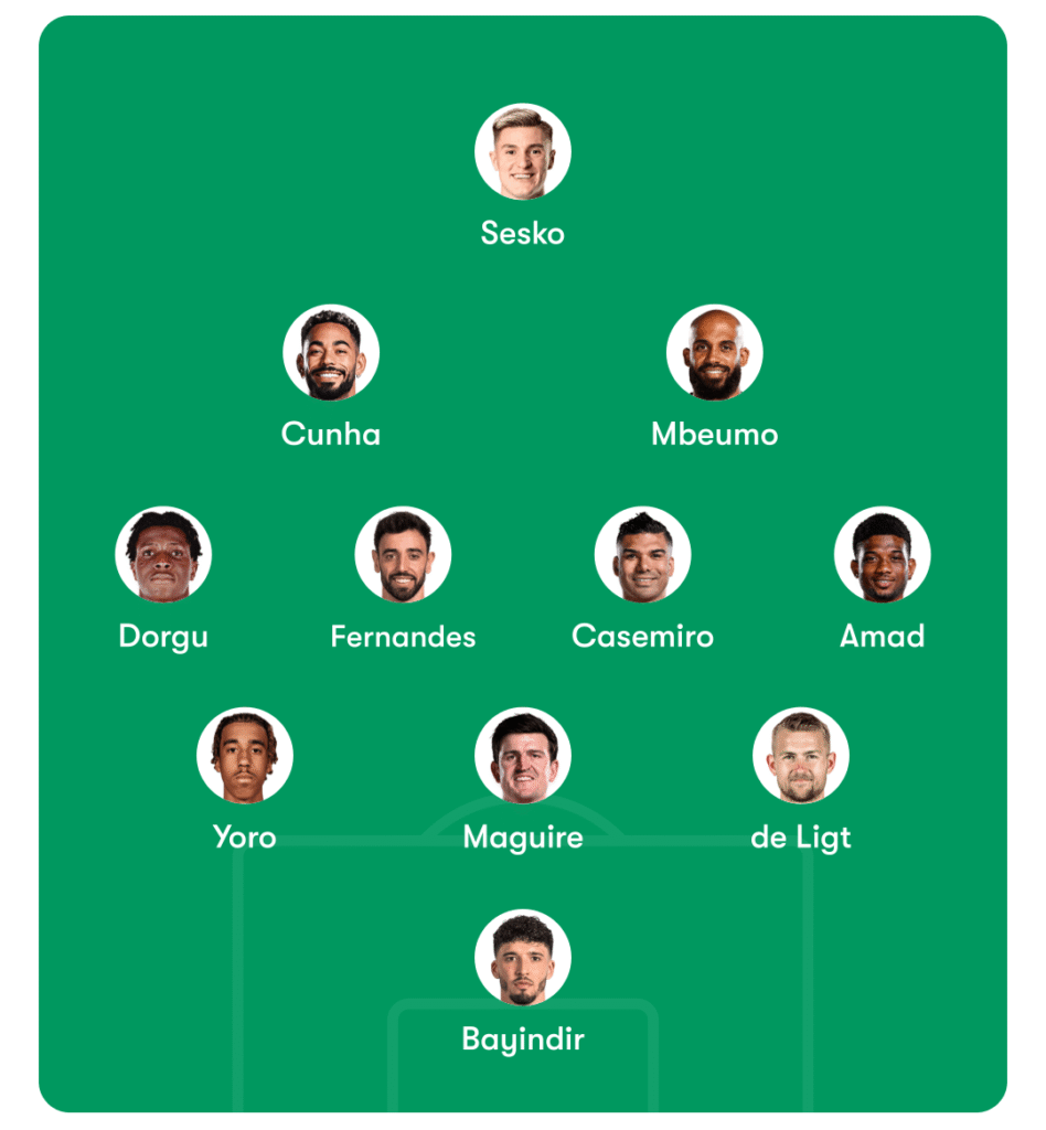Casemiro returns from his 1 match suspension and should immediately re take his spot in the starting XI alongside Fernandes. Ugarte drops to the bench.