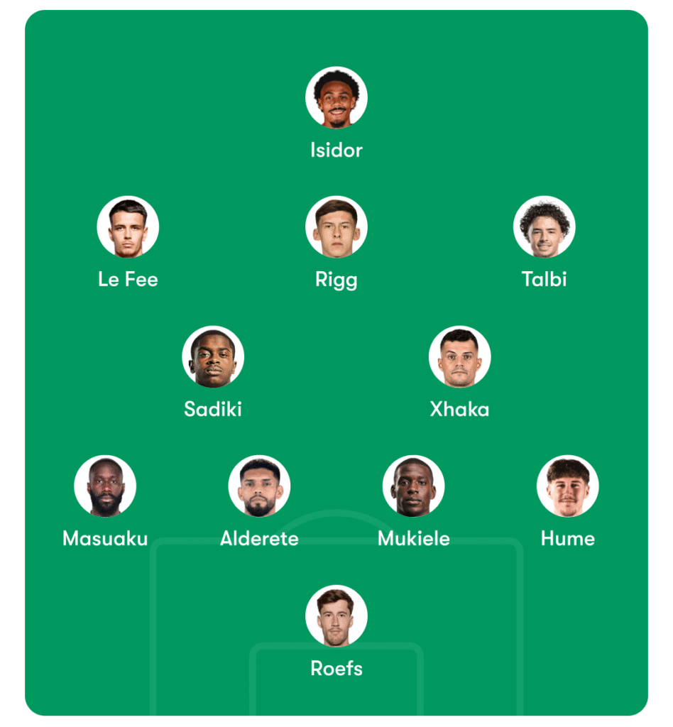 Chris Rigg has become Le Bris preferred midfield partner for Xhaka and Sadiki while Diarra is out injured until December. Rigg has played in a flat 3 alongside Xhaka and Sadiki, but also as the 10 ahead of them since entering the starting lineup, which shows he’s versatile and why he is a locked in starter while Diarra is injured.